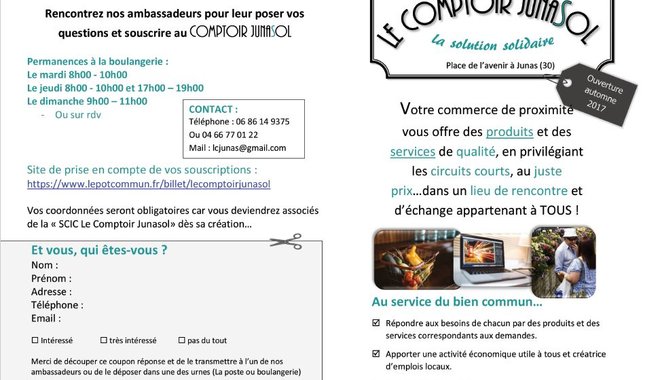 Chaque junassol, mais aussi les habitants des villages voisins) adulte est invité à prendre au moins une part à 50€ pour permettre la création du Comptoir JunaSol.